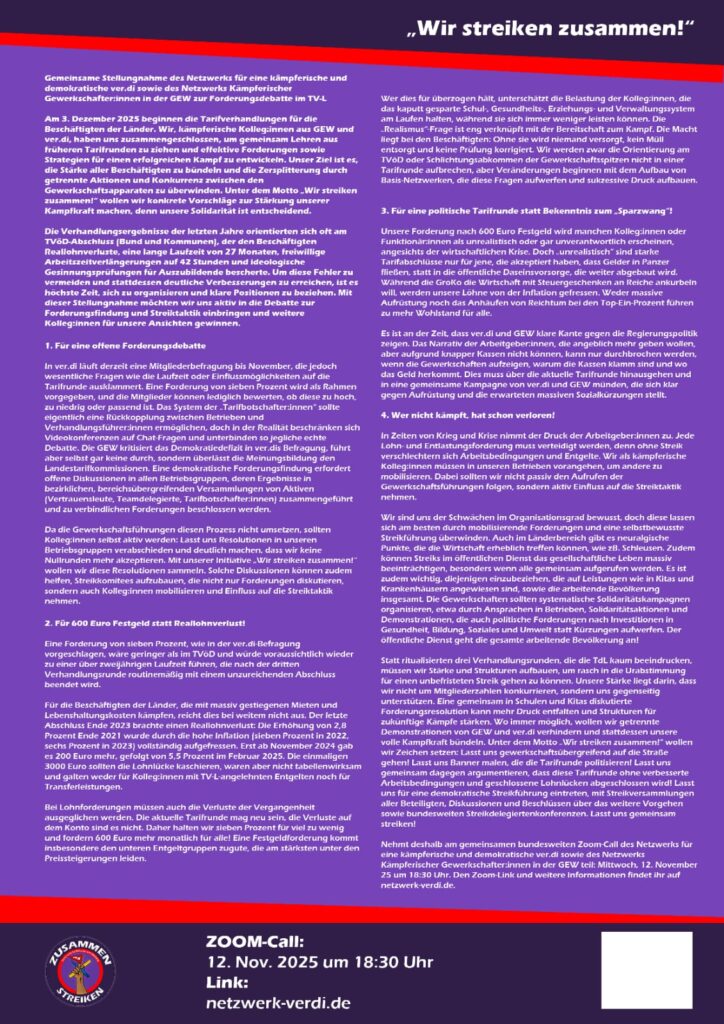 Wir veröffentlichen die gemeinsame Stellungnahme des Netzwerks für eine kämpferische und demokratische ver.di sowie des Netzwerks Kämpferischer Gewerkschafter:innen in der GEW zur Forderungsdebatte im TV-L.